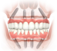 Протез устанавливается не на опорные зубы (которых при полной адентии и нет), а на предварительно вживленные 4 импланта. Импланты устанавливаются в кость челюсти в заранее определенные участки, и затем на имплантах фиксируется зубной протез
